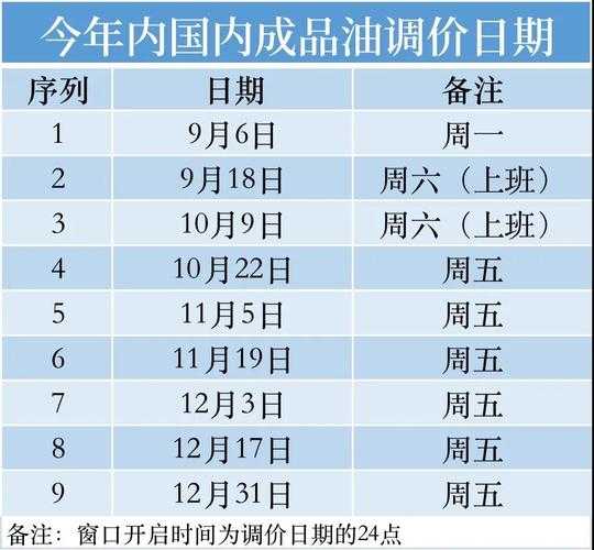 月油价调整时间:7月1日24时、7月15日24时、7月29日24时。8月油价调整时间:8月12日24时,8月26日24时。9月油价调整时间:9月9日24时,9月23日24时。10月油价调整时间:10月15日24时,10月29日24时。