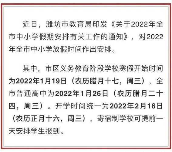 义务教育阶段校、幼儿园。义务教育阶段校、幼儿园假期开始时间为2022年1月15日(腊月十三),寒假结束时间为2022年2月15日(正月十五),2月16日(正月十六)报到开。