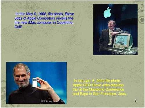 3、乔布斯被认为是计算机业界与娱乐业界的标志性人物,他经历了苹果公司几十年的起落与兴衰,先后和推出了麦金塔计算机(Macintosh)、iMac、iPod、iPhone、iPad等风靡的电子产深刻地改变了现代通讯、娱乐、生活方式。乔布斯同时也是前Pixar动画公司的董事长及行政总裁。