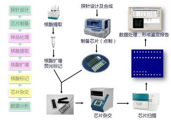 芯片又称DNA芯片、生物芯片,芯片的测序原理是杂交测序方法,即通过与一组已知序列的核酸探针杂交进行核酸序列测定的方法,在一块基片表面固定了序列已知的靶核苷酸的探针。