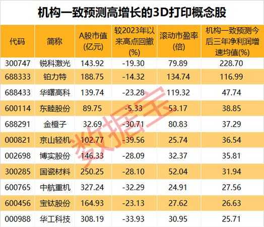 据了解,尽管和3D印概念相关的公司众多,但实际上真正相关的公司寥寥无几。目前A市场上有数家公司直接涉及该领域,分别为银邦份(300337,吧)(300337)、南风份(300004,吧)(300004)、宏昌电子(603002,吧)(603002)、中航重机(600765,吧)(600765)、华中数控(300161,吧)(300161)等。 资料来源于:凌云3D网