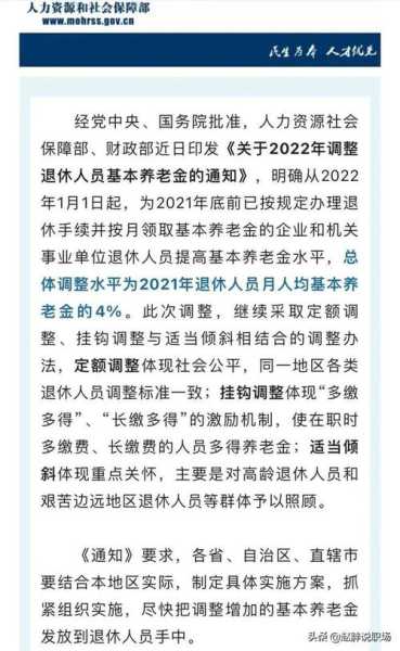 及企事业单位退休人员的退休金调整已于7月份全部补发到位。根据人社部、下发的调整退休金方案,仍然和往年一样,按照定额调整、挂钩调整和向老龄人员倾斜的政策。增加幅度为4%,例如陕西省定额调整为每人增加50元;挂钩调整工龄15年增加16元,超过15年部分,每年增加2.2元。在2021年底的基本退休金增加1%;对2021年12月年满70岁的老人增加10元;年满75岁增加20元;年满80岁增加30元……