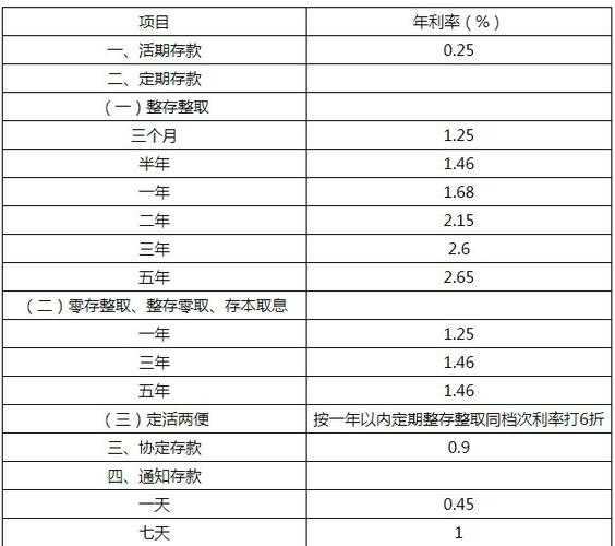 >(1.2)定期整存整取:三个月年利率是1.25%,六个月是1.45%,一年是1.65%,二年是2.15%,三年是2.60%,五年是2.65%。