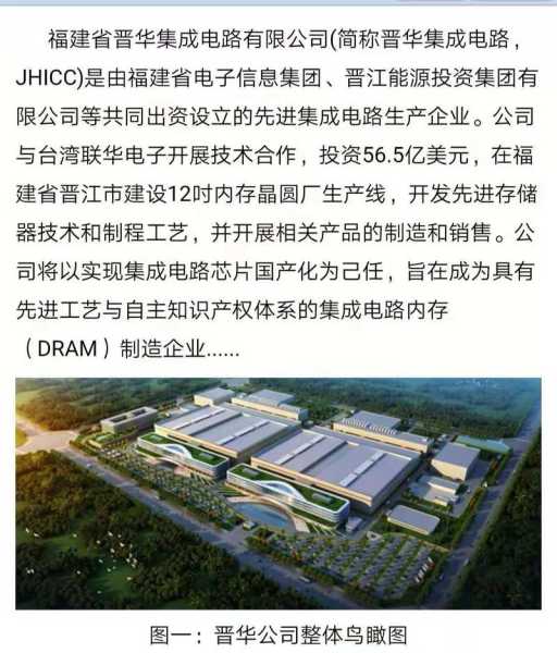 福建晋华集成电路有限公司(简称晋华公司,JHICC)成立于2016年2月,坐落于滨海城市福建晋江,是由福建省电子信息集团和福建省晋江产业发展投资集团有限公司(原晋江市能源投资集团有限公司)共同出资成立的集成电路生产企业,总规划面积637亩,是福建省集成电路领域的大型国有企业。