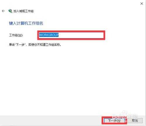 5、在工作组中,填写“WORKGROUP”,如下图所示: