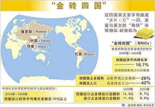 2001年美国高盛公司提出由巴西、、印度、组成的“金砖四国”概念, 2010年南非加入,组成金砖五国。