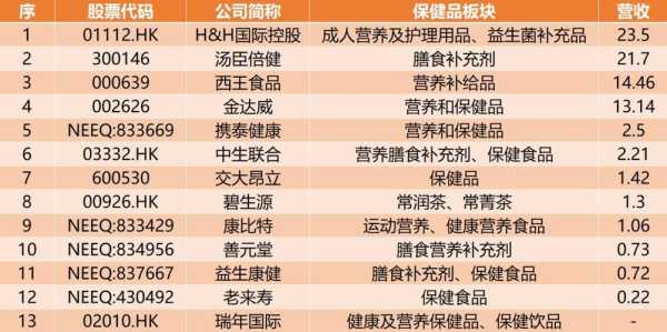 汤臣倍健:交大昂立(600530):健康元(600380):东阿阿胶:江业(600750):海南椰岛(600238):保健酒市场的者天坛生物(600161):通化东宝(600867):天士力(600535):太太药业:健特生物:海王生物(000078):哈药份(600664)等等