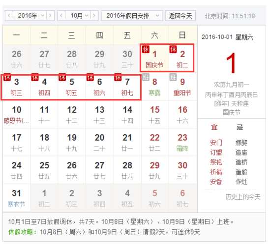 2020年10月放假安排?