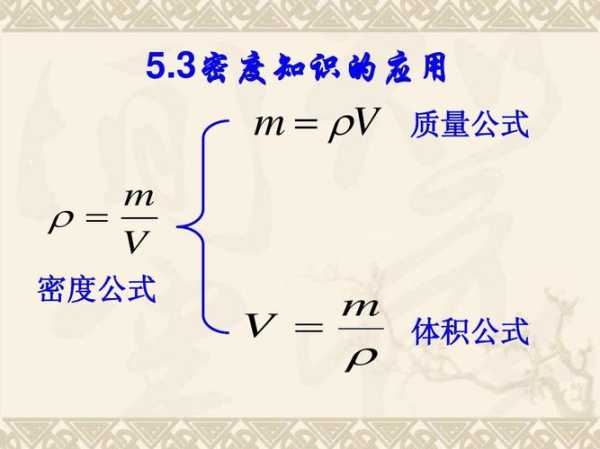 密度=质量/积(ρ=m/V)(同种物质组成的物的质量与积成正比)。
