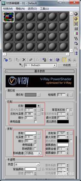 >2、3d透明玻璃材质主要调节的参数有5个,基本材质为VRayMtl,反射值为255,涅尔反射钩,细分为32,折射值为255反射RGB的颜色均调为255,折射RGB的颜色也调为255。