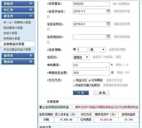 银行也有基金收益计算器,在银行网站内找到基金收益计算器,然后输入基金代码、总投资金额、交易类型、申购费率、分红方式、申购日期、收益计算日期等,然后点击计算即可。计算结果为收益计算日当日未赎前基金持有情况。