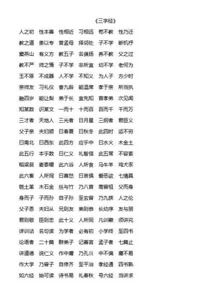 人之初,性本善。性相近,习相远。苟不教,性乃迁。教之道,贵以专。子不,非所宜。幼不,老何为。玉不琢,不成器。人不,不知义。
