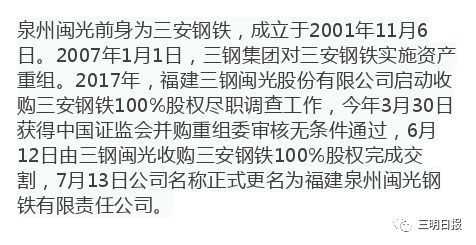 福建三钢闽光份有限公司成立于2001年12月,注册资本24.5157亿,:福建三明市三元区工业中路群工三路。是福建省三钢集团(福建省国资委直接管理的省属国有企业)控子公司,持比例达73.8732%。集团是福建省钢铁生产基地,拥有十家二级单位,16个相关铺助部门和一家分公司,员工6990人,年营收141.17亿。