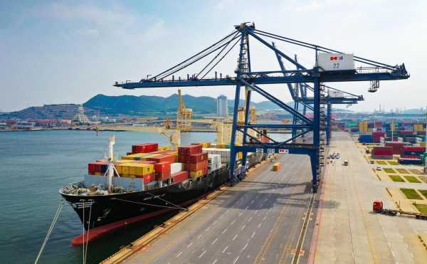 大连港码。位于辽东半岛南端的大连湾内,港阔水深,冬季不冻,万吨货轮畅通无阻。大连是哈大线的终点,以东北三省为经济腹地,是东北的门户,也是东北地区的综合性外贸口岸。