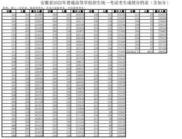 >安徽省总分及各科分数值一览表