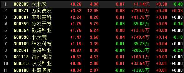 大禹节水,梅安森,隆高科,星光农机,苏垦农发,温室份,大北农。
