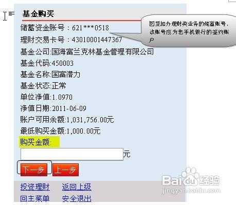 查询方法::找到自己买的基金公司的网页,找.(1)是用基金帐号,(2)是用.选(2),输入你的号码,密码是你的后6位,然后就可以了.