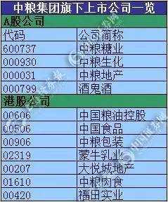 1.中量集团旗下票有食品(00506.HK)、中粮控(00606.HK)、中粮包装(00906.HK)、大悦城地产(00207.HK)、中粮糖业(600737.SH)、蒙牛乳业(02319.HK)、中粮肉食(01610.HK)、福田实业(00420.HK)、雅士利(01230.HK)、现代(01117.HK)、酒鬼酒(000799.SZ)、中粮地产(000031.SZ)、中粮生化(000930.SZ)。