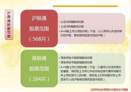 港通包括恒生综合大型指以及恒生综合中型指数所有成份,共268只票。沪通包括所有上证180指数及上证380指数成份,以同时在沪港两地上市的A+H票。共568只票
