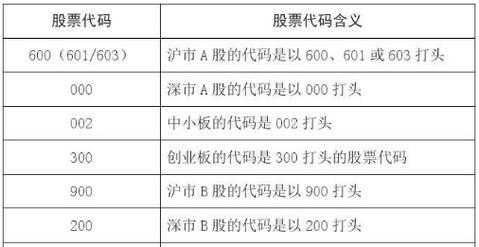 沪市A票买卖的代码是以600、601或603,如:运盛实业:票代码是600767。国航:票代码是601111。应流份:票代码是603308。B买卖的代码是以900,如:仪电B:代码是900901。沪市新申购的代码是以730。如:中信证券:申购的代码是730030。深市新申购的代码与深市票买卖代码一样,如:中信证券在深市市值配售代码是003030。配代码,沪市以700,深市以080。如:运盛实业配代码是700767。深市草原兴发配代码是080780。2.深交编码 以前深交所的证券代码是四位,前不久已经升为六位具变化如下:深圳证券市场的证券代码由原来的4位长度统一升为6位长度。1、新证券代码编码规则升位后的证券代码采用6位数字编码,编码规则定义如下:顺序编码区:6位代码中的第3位到第6位,取值范围为0001-9999。证券种类标识区:6位代码中的最左两位,其中位标识证券大类,第2位标识该大类下的衍生证券。位 第2位 第3-6位 定义0 0 xxxx A证券3 xxxx AA2权证7 xxxx A增发8 xxxx AA1权证9 xxxx A转配1 0 xxxx 国债现货1 xxxx 债券2 xxxx 可转换债券3 xxxx 国债购1 7 xxxx 原有投资基金8 xxxx 证券投资基金2 0 xxxx B证券7 xxxx B增发8 xxxx B权证3 0 xxxx 创业板证券7 xxxx 创业板增发8 xxxx 创业板权证3 9 xxxx 综合指数/成份指数2、新旧证券代码转换此次A证券代码升位方法为原代码前加“00”,但有两个A票升位方法特殊,分别是“0696 ST联益”和“0896 豫能控”,升位后票代码分别为“001696”和“001896”。票代码中的临时代码和特殊符号临时代码新:新发行申购代码为730***,新申购款代码为740***,新配号代码为741***;新配售代码为737***,新配售的配号(又称“新值号”)为747***;可转换债券发行申购代码为733***; 深市A票买卖的代码是以000,如:顺鑫农业:票代码是000860。B买卖的代码是以200,如:深中冠B,代码是200018。中小板票代码以002,如:东华合创票代码是002065。创业板票代码以300,如:探路者票代码是:300005市场代码意义?