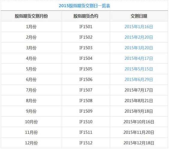 就期货合约而言,交割日是指必须进行商品交割的日期。买卖指期货的本质是与他人签订在指期货交易及交割地点约定的时间内,按约定的和数量买卖期指的合约。这个合约都有约定的最后交易日(就是最后履行合约的日子,一般是合约月份的第三个周五),这就是期指的交割日。约定的最后履约时间到了,买卖双方必须仓(解除合约)或交割(现金结算)。指期货与商品期货一样,每个合约都有交割日,到了这一天,所有该合约仓结算。的指期货交割日是合约交割月的第3个周五,如2009年11月合约(IF0911)交割日是11月的第3个周五即11月20号。 沪深300期指每个月都有一个合约交割,而不是3、6、9、12 但许多外盘期指只设立季末合约,故3、6、9、12四个月份有交割合约。沪深300期指同时4个合约,分别是当月、下月、下季、下下季。如2009年11月11日,我们可以看到0911、0912、1003、1006四个合约,0911合约20日交割后,1001合约,保持四个合约同时交易。由于四个合约总有一个是当月合约,所以每个月都有合约进入交割。