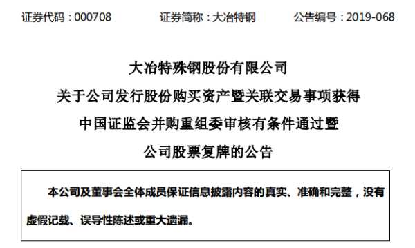 >1993年5月,经湖北省改委批准,由大冶钢厂作为主要发起人,以其生产经营主部分与东风汽车公司、襄阳汽车轴承份有限公司三家共同发起,以定向募集方式组建大冶特殊钢份有限公司。