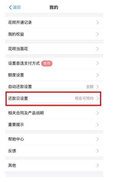 4、找到花呗的“还款日设置”的选项,点击进入该选项。