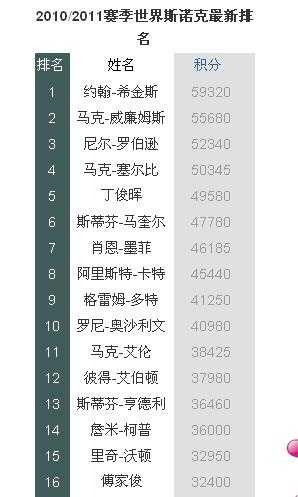 克世界排名是按每次比赛所得的奖金累计总额拍名的,没次比赛奖金,其次是亚军,一次网下排,每次比赛累计奖金排名