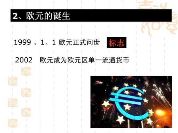 >1999年1月1月:欧洲货币联盟进入第三阶段,欧元正式诞生。欧洲银行确定统一的货币政策,银行间大额结算开始使用欧元,各金融市场也均以欧元进行结算。