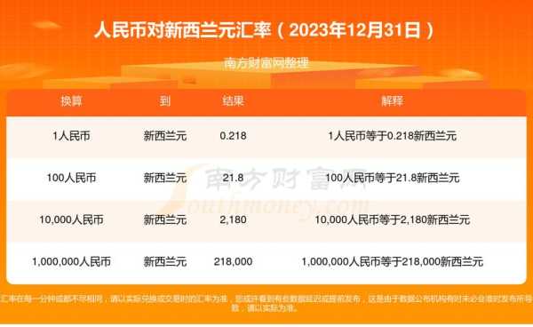 货币兑换1新西兰元=4.90291=0.2040新西兰元10000新西兰元=49029.2491以上为银行汇率信息,供参考。交易时请以银行柜台成交价为准。