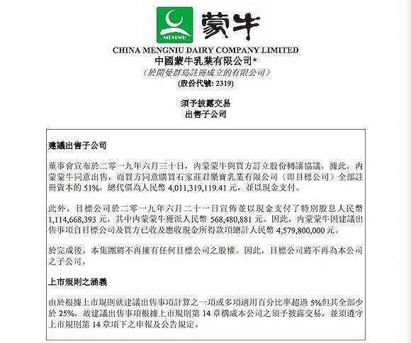 >蒙牛乳业(02319.HK)发布公告称,子公司内蒙蒙牛与买方鹏海基金及君乾管理在6月30日订立份转让协议,石家庄君乐宝乳业有限公司(下称“君乐宝”)全部注册资本的51%,总代价为40.11亿元,并以现金支付。
