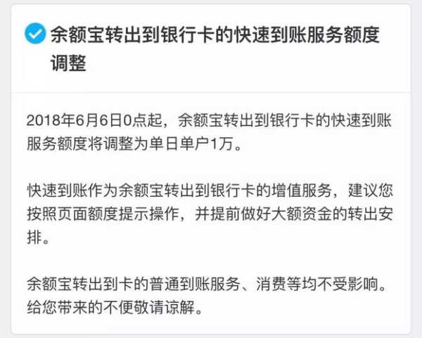 正文 余额宝转入转出限额 余额转出限额是多少? 财汇天下 V管理员 /2024-08-19 11:11:52 /0 评论 /77 阅读 0819 此篇文章发布距今已超过547天,您需要注意文章的内容或图片是否可用! 本文目录余额转出限额是多少?(图片来源网络,侵删)余额转出限额是多少?余额宝转出限额的参考标准是:1、余额宝转出到余额:单日单月无额度。2、余额宝转出到快捷:不同银行的可转出额度也会有所不同。快速到账单日单户额度为1万元,普通到账每日不限额度。温馨提示:单个用户使用余额宝转出到一天100次,无月累计上限,且余额宝转出到不收费。 免责声明:文章部分内容来自于网络收集,如有异议请发送邮件到管理员邮箱,并注明文章链接和问题,我们收到后会即刻删除,谢谢