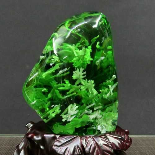 绿水晶属于二氧化硅,化式为SiO2。因内含镁铁化合物而呈现绿色。产量稀少。绿水晶极其罕见。里面的包裹是绿的,但水晶本身还是无色透明的,所以市场上出现的大量绿色透明的水晶颜色基本都是处理的,而且多数本身就是合成水晶