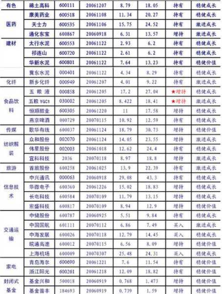蓝筹又称绩优,实力。经营管理良好,创利能力稳定、连年报东的公司票。这类公司在行业景气和不景气时都有能力赚取利润,风险较小。蓝筹在市场上受到追捧,因此较高。 电力:600886 国投电力、 000027 深能源A、 600642 申能份 、600900 长江电力、 600795 国电电力 交通运输: 600026 中海发展 、600317 营口港、 600428 中远航运、 000089 深圳机场 、600012 皖通高速 、000429 粤高速 电力设备: 000400 许继电气、 600312 高电气 石化化工: 600409 三友化工、 000949 新乡化纤 、000677 山东海龙 、000525 红太阳 000510 、金路集团 600028 机械: 000680 山推份 、600560 金自天正、 600879 火箭份 、600169 太原重工 钢铁: 600581 八一钢铁 汽车: 000800 一汽轿车、 600104 上海汽车 、000625 长安汽车、 600006 东风汽车 医药: 600267 海正药业、 600594 益佰制药 、600055 万东、 600587 新华 造纸: 000488 晨鸣纸业 、600308 华泰份 信息技术: 600797 浙大网新 、000970 中科三环 、002065 东华软件 、600487 亨通光电 建材: 000401 冀东水泥 、600801 华新水泥 水务: 000826 合加资源 家电: 600690 青岛海尔 有色金属: 600547 山东黄金、 600489 中金黄金 、600472 包铝业、 000831 关铝份 煤炭: 601001 大同煤业 、600123 兰花科创 食品: 600300 维维份 纺织服装: 600177 雅戈尔 注意:一线蓝筹和二线蓝筹之间并没有明显的界限区分,同一支票,有人认为是一线也有人认为是二线,所以以上票列举供参考。