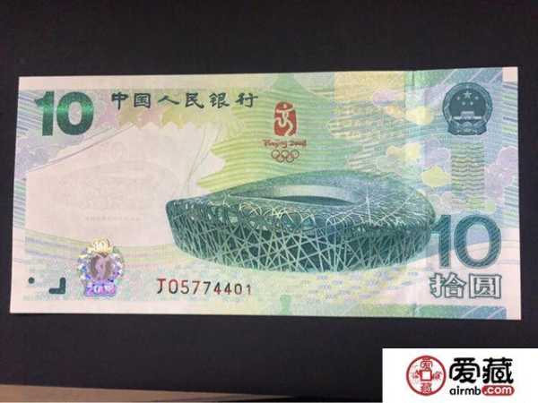 我国于2008年发行了奥运会普通流通纪念币。这张纪念钞是我国发行的第三张流通纪念钞,发行量相对较少,面值是10元,可以等面值的在市场上流通。由于发行量少,这枚纪念钞的价值现在已经涨到4000元左右一张。