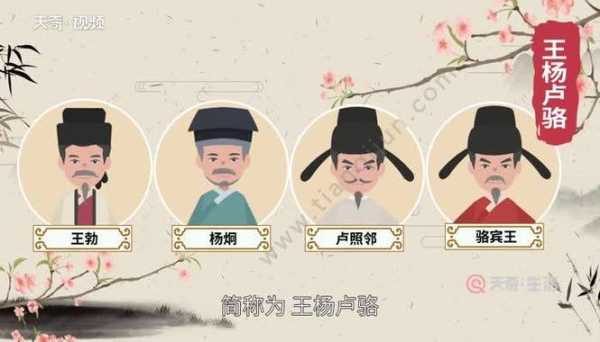 唐代初年,四位很有才华的文家王勃、杨炯、卢照邻、骆宾王被合称“初唐四杰”,简称“王杨卢骆”。他们四人才名早享,在青少年时代就获得美誉。骈文和赋成就出色,是初唐文坛上新旧过渡时期的人物。他们的诗歌扭转了唐朝以前萎靡浮华的宫廷诗歌风气,使诗歌题材从亭台楼阁、雪月的狭小邻域扩展到江河山川、边塞江漠的辽阔空间,赋予诗以新的生命力。