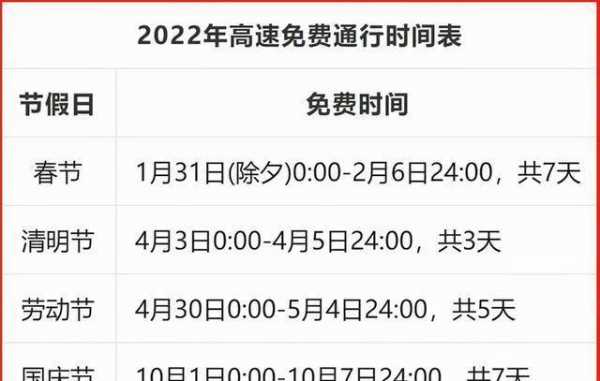 免费时段为节假日天00:00开始,最后一天24;00结束,其中,普通公路以车辆通过收费站收费通道时间为准。高速公路以车辆驶离出口收费通道时间为准。行驶高速公路的只要在天00:00至最后一天24:00之间驶离出口收费通道都能享受免费政策。