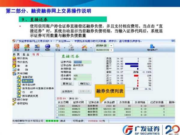 6、开立融资融券的信用账户、融资融券的资金账户后,投资者还需要到相应的商业银行办理融资融券信用的第三方存管业务才能正式开始此项业务。 融资融券交易,又称信用交易,分为融资交易和融券交易。通俗地说,融资交易就是投资者以资金或证券作为质押,向券商借入资金用于证券买卖,并在约定的期限内偿还借款本金和利息;融券交易是投资者以资金或证券作为质押,向券商借入证券卖出,在约定的期限内,买入相同数量和品种的证券归还券商并支付相应的融券费用。 要融资融券首先要开设一个信用账户,符合条件的投资者(其中一个基本条件是资金证券超过50万元),要在原来票账户下设一个信用账户,这个账户专门用于融资融券业务,融资买入或者融券借来的票均登记在这个账户里。