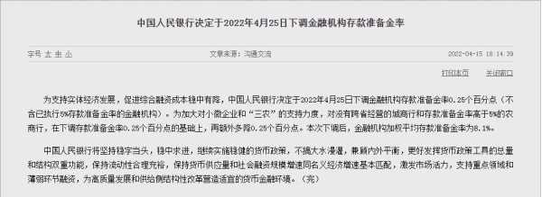 2022年降准来了!4月15日晚间,央行宣布,决定于2022年4月25日下调金融存款准备金率0.25个百分点(不含已执行5%存款准备金率的金融)。本次下调后,金融加权均存款准备金率为8.1%。此次降准为降准,共计释放长期资金约5300亿元。距离上次降准,时间刚好走过9个月。