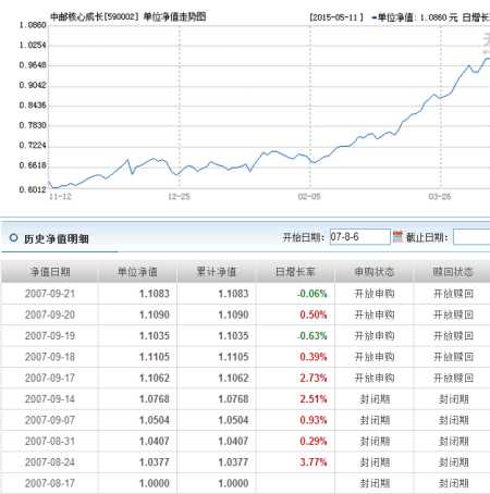 中邮核心成长混合(基金代码590002,中高风险,波动幅度较大,适合较积极的投资者)2007年9月21日单位净值为1.1083元