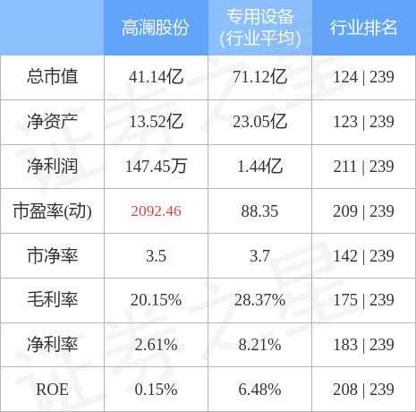 高澜份属于设备行业。公司财务状况良好,近三年营业收入高速增长,净利润小幅增长。当前PE为51.3,处于历史正常估值区间,比同行估值较低,具备投资价值。