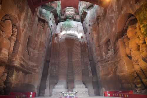 佛像于唐玄宗开元初年(公元713年)开始动工,当大佛修到肩部的时候,海通和尚就去世了。海通后,工程一度中断。多年后,剑南西川节度使章仇兼琼捐赠俸金,海通的徒弟领着工匠继续修造大佛,由于工程浩大,朝廷下令赐麻盐税款,使工程进展迅速。