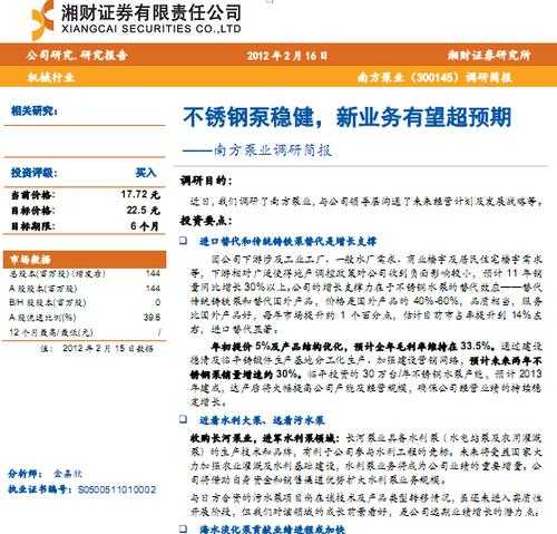 正文 300145股票 南方泵业怎么样? 财汇天下 V管理员 /2024-08-23 19:17:52 /0 评论 /84 阅读 0823 此篇文章发布距今已超过539天,您需要注意文章的内容或图片是否可用! 本文目录南方泵业怎么样?(图片来源网络,侵删)南方泵业怎么样?很好!南方泵业份有限公司(简称南方泵业),作为南方中金环境份有限公司旗下南泵事业部,创建于1991年,2010年12月9日在深圳交易所发行上市,票代码:“300145”,是较早研发并规模化生产不锈钢冲压离心泵、海水淡化高压泵的企业 免责声明:文章部分内容来自于网络收集,如有异议请发送邮件到管理员邮箱,并注明文章链接和问题,我们收到后会即刻删除,谢谢