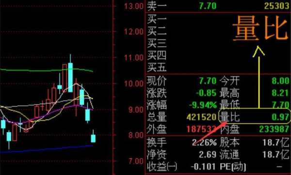 量比是衡量相对成交量的指标。它是指市开市后均每分钟的成交量与过去5个交易日均每分钟成交量之比。其计算公式为:量比=现成交总数/现累计开市时间(分)/过去5日均每分钟成交量。 量比在观察成交量方面,是卓有成效的分析工具,它将某只票在某个时点上的成交量与一段时间的成交量均值进行比较,排除了因本不同造成的不可比情况,是发现成交量异动的重要指标。在时间参数上,多使用10日均量,也有使用5日均值的。在大盘处于活跃的情况下,适宜用较短期的时间参数,而在大盘处于熊市或缩量调整阶段宜用稍长的时间参数。 但“量比”由于数值单一,投资者在运用时会发现其有先天的不足。如果把当日每分钟的量比数值放在同一坐标系内并连线,就形成了更加直观、便于作的量比曲线。 由于“量”是“价”的先导,因此我们可以根据量比曲线的变化,来分析个买卖力量对比,进而研判该当日的运行趋势。比如周一南开戈德(000537)在开盘后的1小时内,尽管价上涨不到0.10元,但其量比数值0.53稳步上升至2.40左右,这表明当日有主动性买盘介入。10点半以后,该被资金推高,最终以涨停板报收。