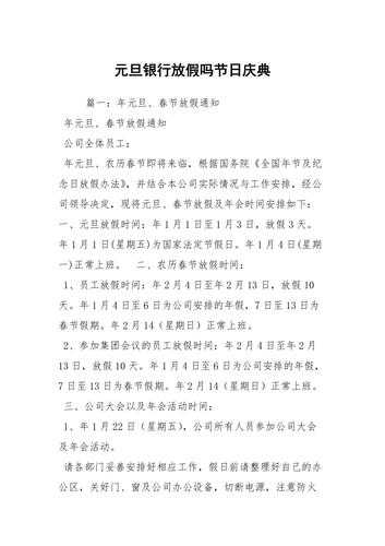 银行元旦放假1天。银行工作分为储存营业,和银行。储存是银行工作的重点。它的业务是存款,代款,保险业务。他们节假日也不能停业,为了方便顾客,只能轮休。而银行,实际上是银行的行政部门,职责是管理,分配业务,管理各部门的人事关系等,她们按时休息,节假日。