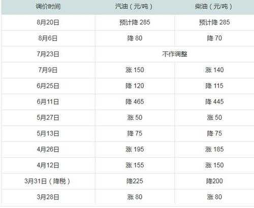 成品油调价周期为10个工作日,计价办法为10个工作日移动均。 当汽、柴油的涨价或降价幅度低于每吨50元,折合到每升调价金额不足5分钱,为节约社会成本,零售暂不作调整,纳入下次调价时累加或冲抵。
