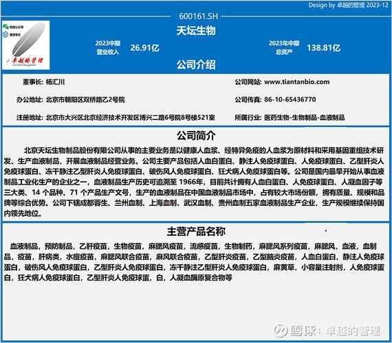 公司全称是天坛生物制品份有限公司(简称"天坛生物"),其上市票为天坛生物(600161)。是一家从事、血液制剂、诊断用品等生物制品的研究、生产和经营的企业,于1998年由生物制品研究所(在上交所发起上市,现在的控东是生物技术集团公司。