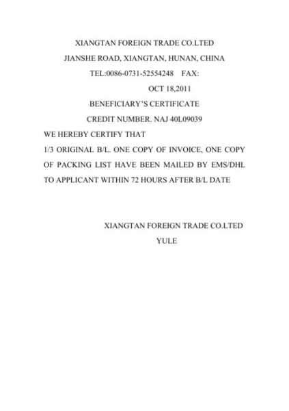 受益人证明(BENEFICIARY'S CERTIFICATE):是一种由受益人自己出具的证明,以便证明自己履行了信用证规定的任务或证明自己按信用证的要求办事,如证明所交货物的、证明运输包装的处理、证明按要求寄单等。件,一般无固定格式,内容多种多样,以英文制作,通常签发一份。