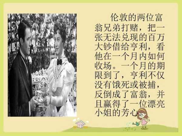 马克吐温的《百万英镑》是一个年轻人靠着两个富翁给的一张一百万支票,社会地位发生巨大变化,免费免费穿,结交上流人士,迎娶白富美,走上人生的故事。