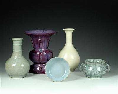 汝窑:汝窑以青瓷为主,“釉色天青色”“蟹爪纹”“香灰色胎”“芝麻挣钉”等是鉴别汝窑的重要依据。其中,蟹爪纹是指釉面开片的纹理毛毛扎扎;“芝麻挣钉”则是因烧造时足部用很小的支钉支起,然后把汝窑瓷器支在空中烧。这样烧制的瓷器烧好后,底部釉面会有几个点。汝窑瓷胎一般较薄,釉层较厚,有玉石般的质感,釉面有很细的开片,而在造型上则比较庄重大方。